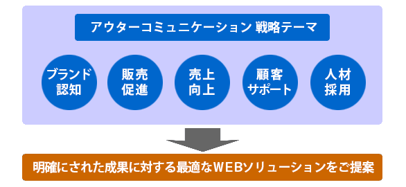 ビジネスにおいて、対外的なコミュニケーションを行う際、WEBサイトは重要なプラットフォームとしての役割が求められます。アーキレッジでは、こうした、企業広報、商品・サービスに関するブランド認知、更に販売促進、オンライン取引、顧客サポートに至るまで、様々なビジネスシーンにおいて、WEBソリューションを活用する目的・目標を明確にさせて頂きます。ここで掲げられた目的・目標に基づいた、最適なシナリオ設計、システム設計、クリエイティヴ設計を行い、成果に導くWEBサイトの構築やWEBソリューションのご提案をいたします。